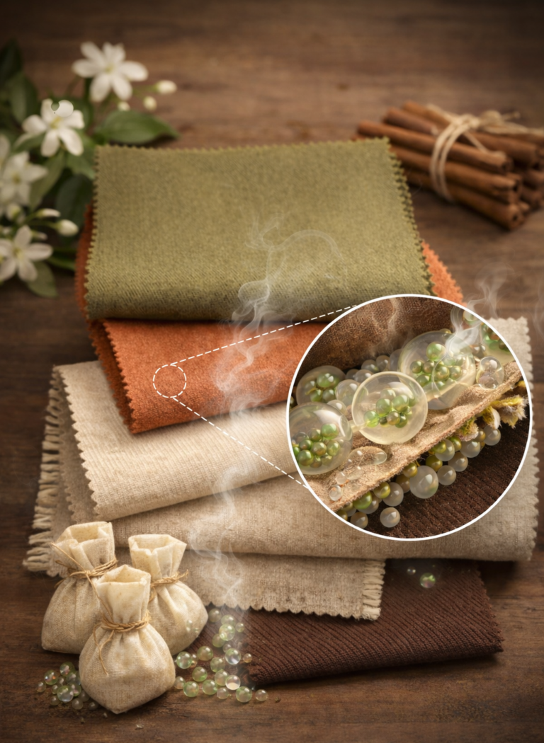 La elección de esta técnica responde al interés de construir una prenda que pueda activar recuerdos, sensaciones y estados de ánimo desde una dimensión íntima y cotidiana. En la colección, el aroma no funciona como un elemento decorativo, sino como una capa conceptual y funcional que acompaña la materialidad de cada conjunto. Así, cada set fue pensado a partir de una relación específica entre color, textura, esencia y beneficio emocional, permitiendo que la experiencia de uso se perciba desde la vista, el tacto y el olfato al mismo tiempo.